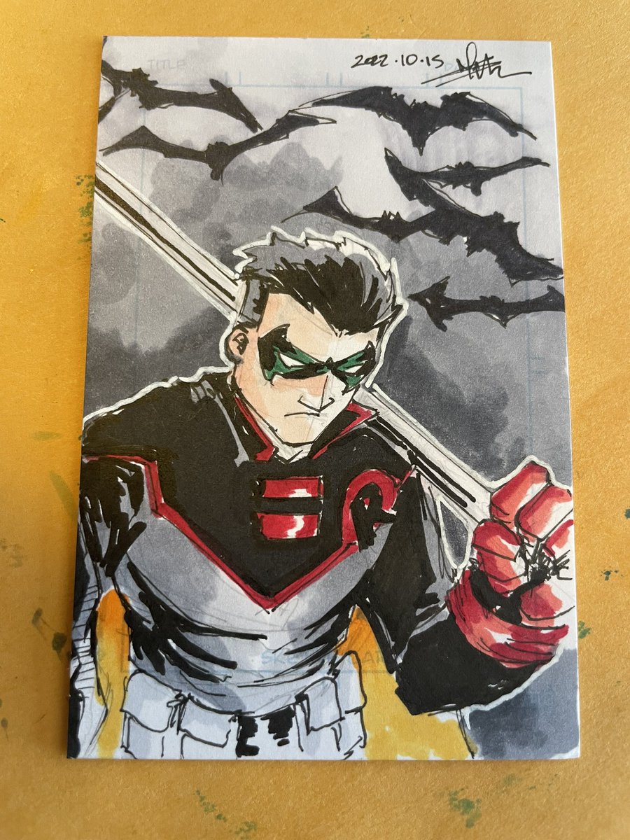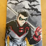Day 17 of Inktober, Damien Wayne, the current Robin. This completes the Bat legacy 3 card set and available. . #art #fanart #dccomics #comics #teentitans #batman #robin #sketchcard #inktober2022 #artistontwittter