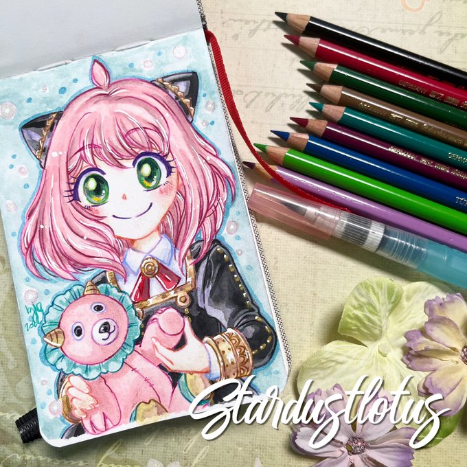 Got a new cute watercolour sketchbook from my dear friend Christina! For this occasion I drew Anya and her Chimera on the first page 💖✨🥰 #AnyaForger #SPYxFamily #SPYFAMILY #fanart #traditionalart