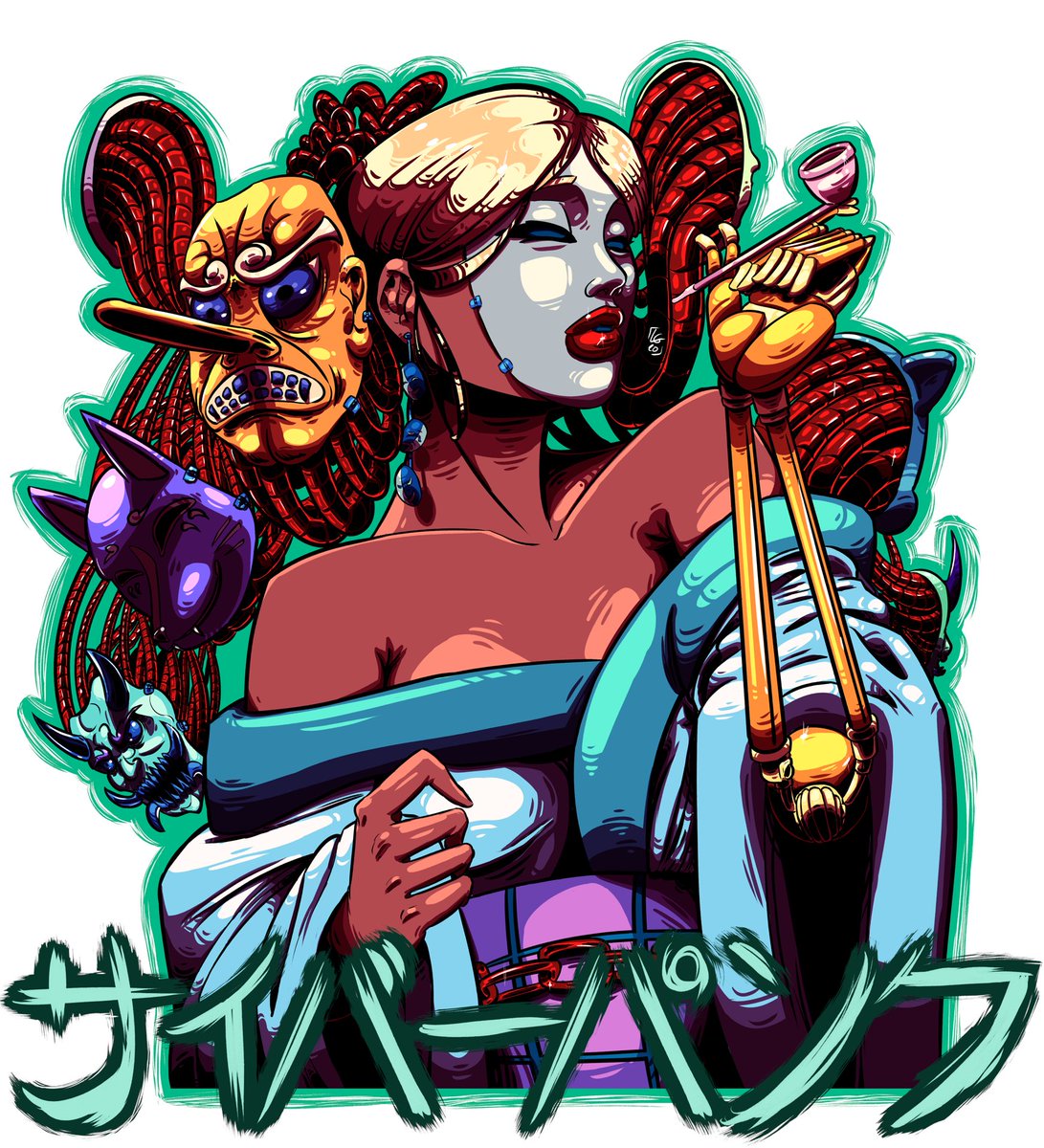 C'est avec plaisir que je vous présente ma participation pour le @WeekAndArt ! Voici mon interprétation du Pandemonium sauce Lo-Fi To Study To Chill To, avec une petite vendeuse de bentos itinérante qui qui propose ses plats à divers yokais ! #wat #illustration