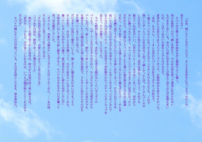 ぺがやまさん(@pegayama)のdnkbのdndカレンダーに書いた7月のSSでした。本当は話し的に文字黄色にしたかったけどくそ読みづらくて断念しました。 ダンデメインなのでほぼダンデしかしゃべってないです。画像拡大して読んでください~!