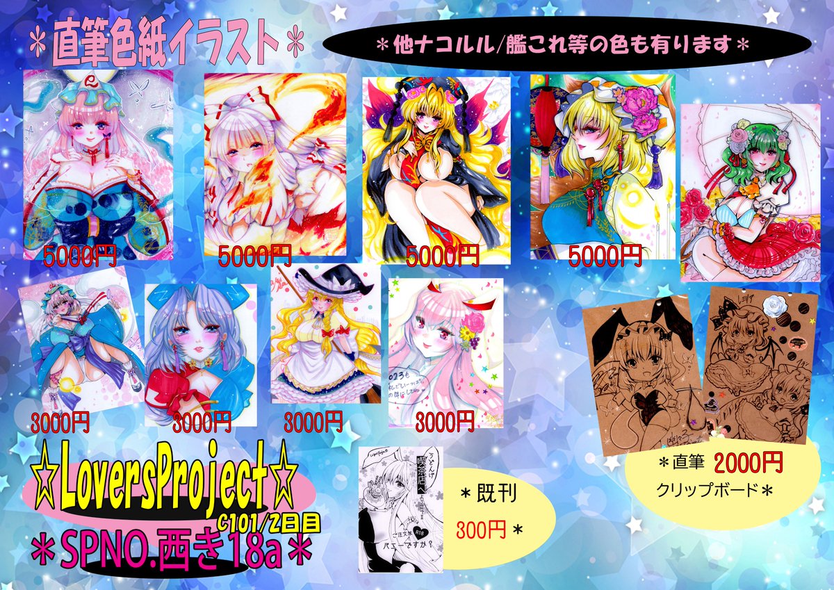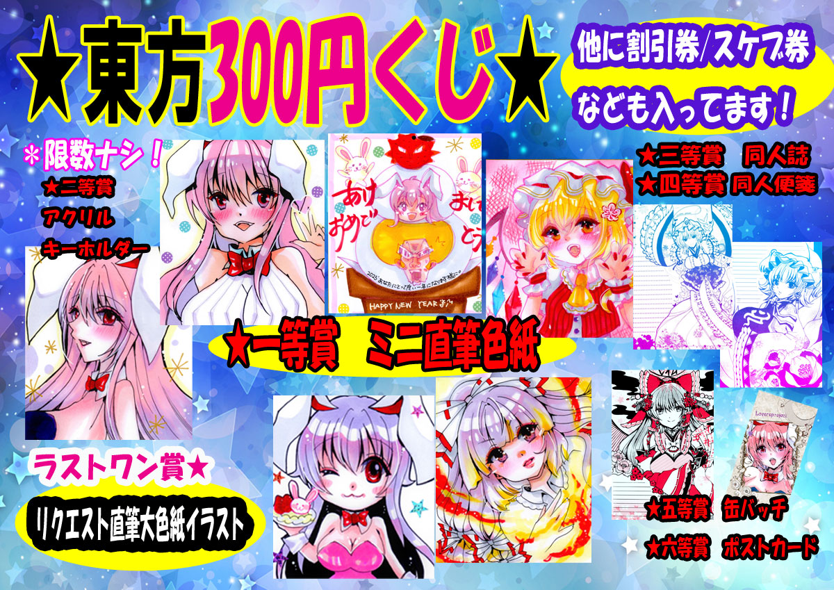 3/12 東方合同祭事 お品書き完成しました! 新作色紙中心 可愛いうどんげちゃん沢山描きました~。 14:30オークション&色紙抽選会発表 スケブ購入者様のみOK 遊びにきてね★ #月の宴 #東方合同祭事お品書き