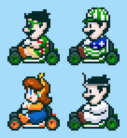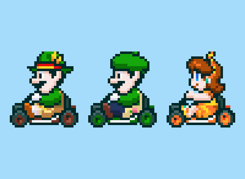 8人揃ったら描こうと決めていたスーパールイデジカート (浴衣デイジー姫のお面の都合で本家とは逆向いてます) #ドット絵 #pixelart #ルイージ #デイジー姫