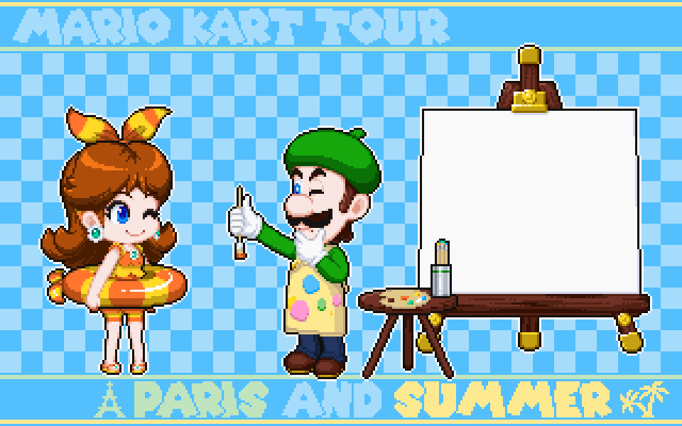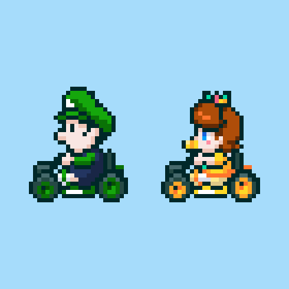43 119 8人揃ったら描こうと決めていたスーパールイデジカート (浴衣デイジー姫のお面の都合で本家とは逆向いてます) #ドット絵 #pixelart #ルイージ #デイジー姫 21/01/02 23:02
