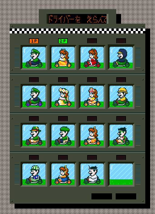 今年になって実装された4人(バケーション・ゴルフ・ファーマー・ドクター)をヘッダーに追加。 ついでにSFC版のキャラ選択画面の枠を拡張して並べてみた。16枠目はどっちが来るかな? #ドット絵 #pixelart