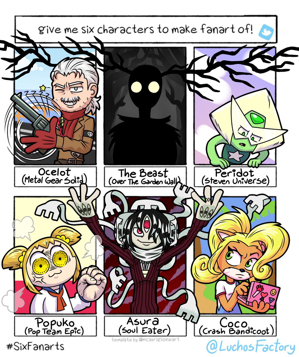 Welp, this was fun, not gonna lie. Pretty interesting selection, I should say! #SixFanarts #SixFanartsChallenge #MetalGearSolid #OverTheGardenWall #StevenUniverse #PopTeamEpic #SoulEater #CrashBandicoot
