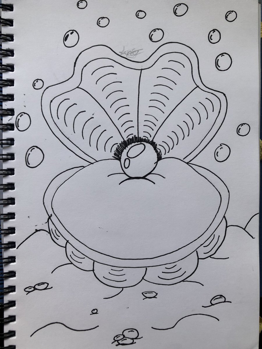 Name of the drawing: Inktober Day 4 - SCALLOP 🦪 #selina800art #selina800arthanddrawn #ink #inktober #inktober2022 #inktober2022scallop #scallopdrawing #pearldrawing #bubblesdrawing #sanddrawing #rockdrawing #hbpencil #flyingtigercopenhagenpenset #flyingtigerpenset #tigerpenset