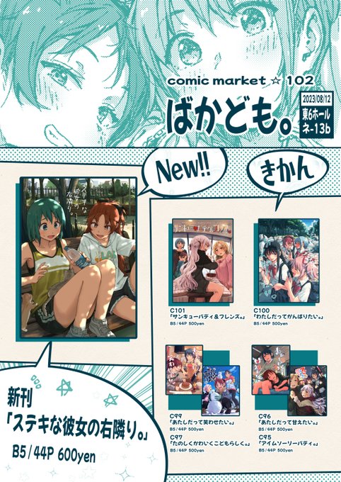 夏コミ1日目(12日)に東ネ-13b「ばかども。」で参加します。びっくり仰天ですが新刊あるんです。常にスペースにいるのでいつでもどうぞー。 多めのサンプル→pixiv.net/artworks/11043… 配置場所→webcatalog-free.circle.ms/Map#17309696/d…