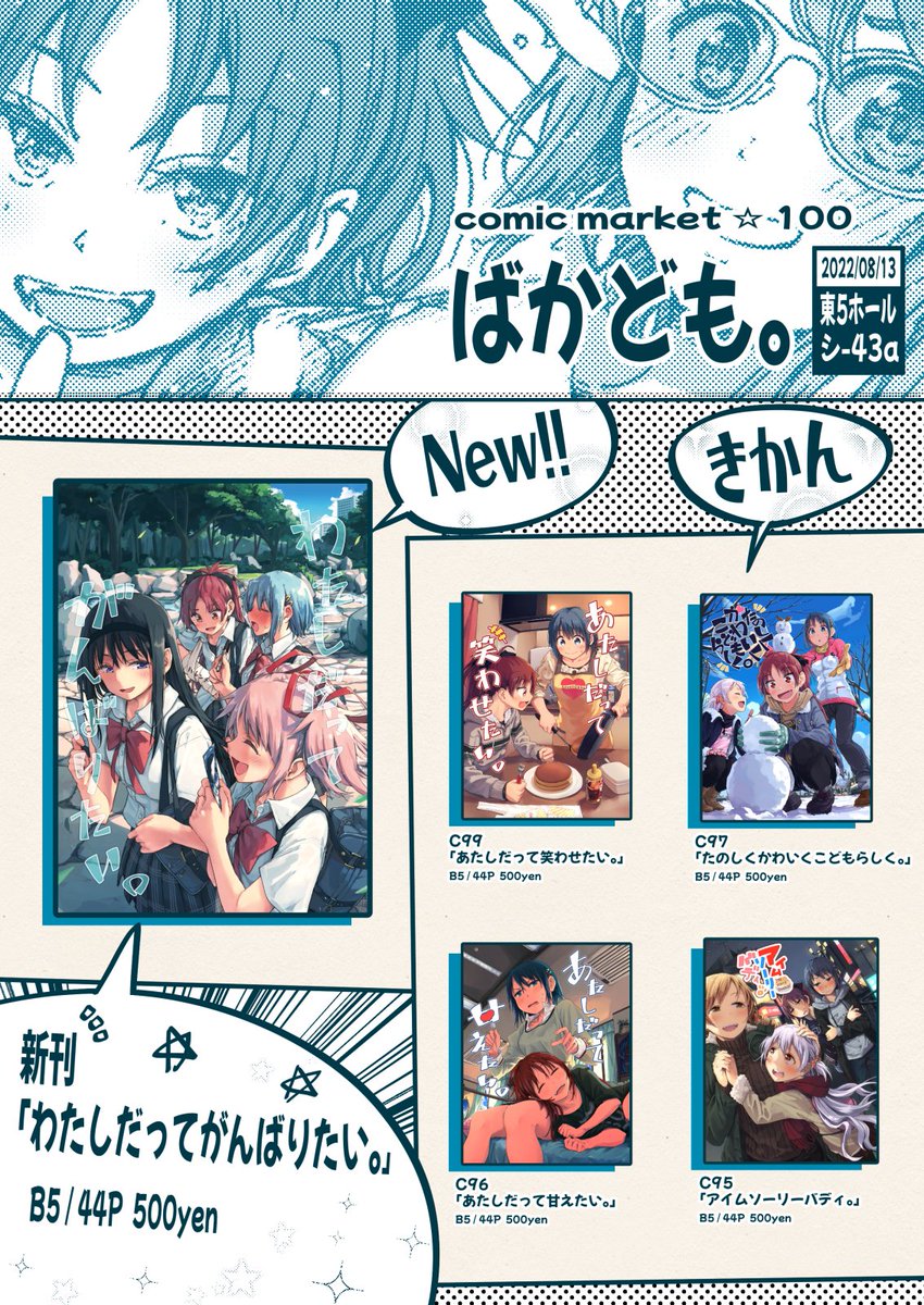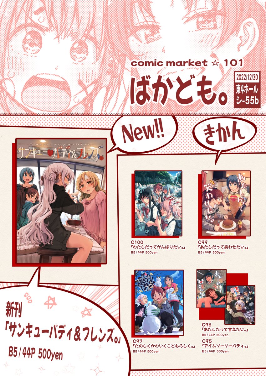 1日目(30日)東P-26b「ばかども。」の頒布物情報ですー。 新刊1種と既刊3種を頒布予定です。全てB5判44Pで頒布価格は各500円の予定です。よろしくおねがいしますー! 各種サンプルはコチラから直近4冊を遡ってください→pixiv.net/artworks/94992… 配置場所→webcatalog.circle.ms/Circle/Map/157…