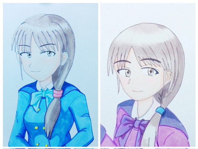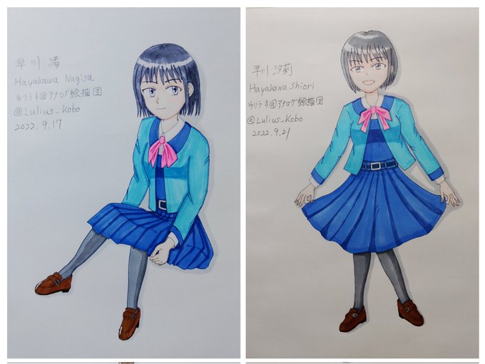 早川姉妹(渚・汐莉) 神奈川県小田原市出身 16歳 高校1年生 実家はみかん農家 双子の姉妹で渚は姉、汐莉が妹。 見た目の違いは髪の長さと胸の大きさ。姉の方が髪が長く、妹の方が胸が大きい。 [左]2022.9 [右]2023.5 #画力ビフォーアフター #オリキャラ