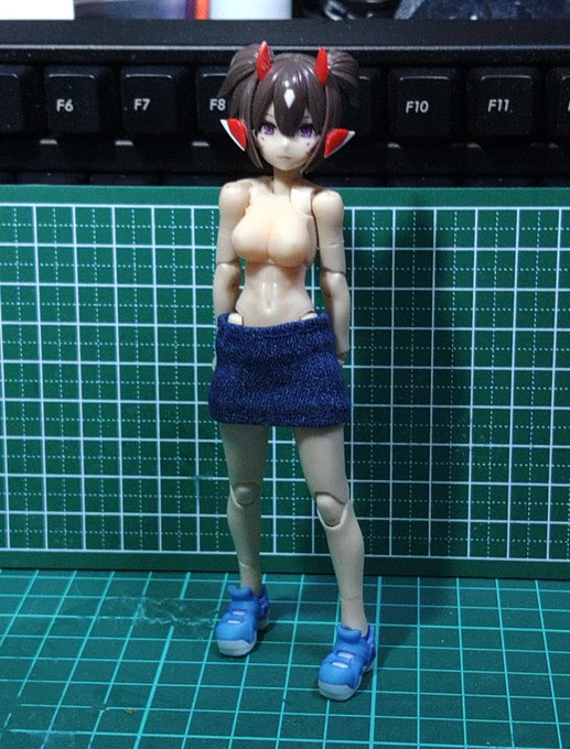 【赤猫便り】 とりあえず生産の目処が立ちました。デニム地タイトミニスカートです。 内側にショーツが一体化してます。ショーツの柄を数パターン用意する予定です。6月中に販売開始できるといいな…💦 #メガミデバイス #メガミの布服