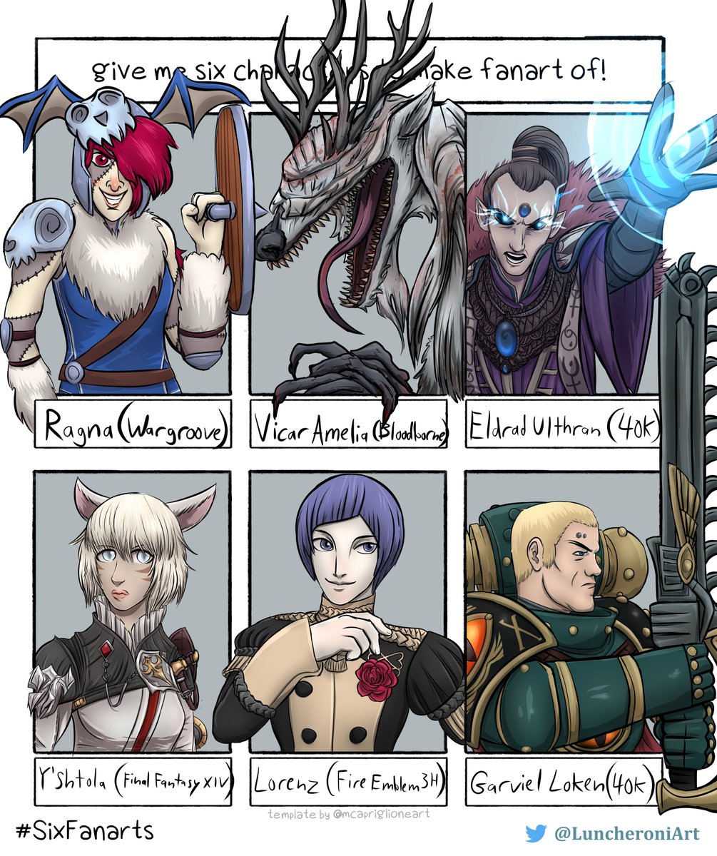 Finally finished my dang #SixFanarts! Have some hashtags! #Fanart #Wargroove #Bloodborne #warhammer40K #40k #Warhammer40000 #HorusHeresy #TheHorusHeresy #FinalFantasyXIV #FFXIV #FE3Houses #FE3H #FireEmblem #FireEmblem3Houses #Ragna #VicarAmelia #Eldrad #Loken #Yshtola #Lorenz