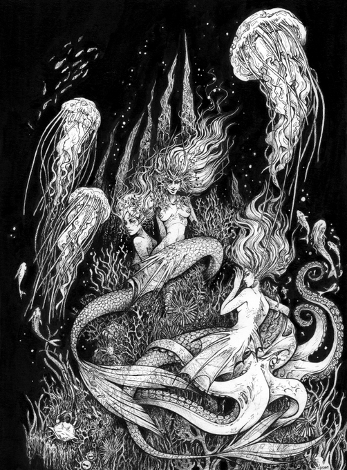 Mermaid, A4 ink illustration #mermaid #ink #illustration #tentacles #sea #fish #lovecraft #jellyfish