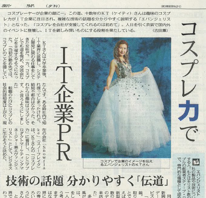 昨日の東京新聞に掲載していただきました。 コスプレイヤーの経験がキャリアに役立つこともある。みんなが思うようなプロコスプレイヤーさんとはまた違ったものなんだと思うけど、こういう道もあるよ!ということで。 tokyo-np.co.jp/article/246358