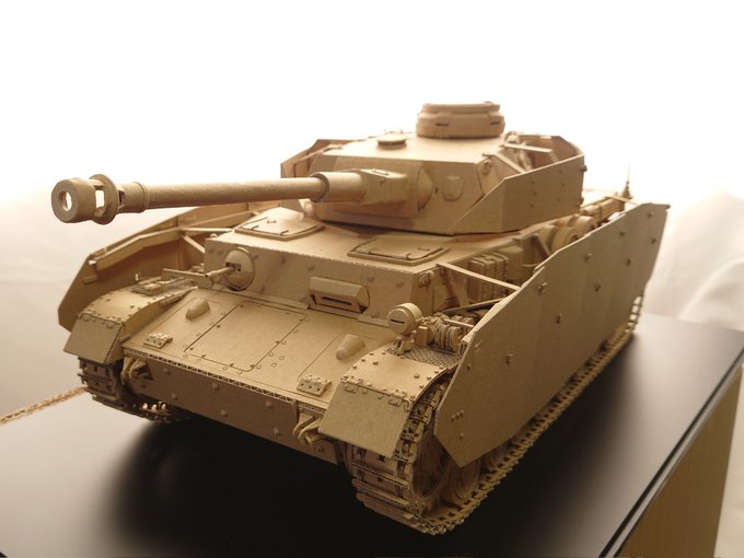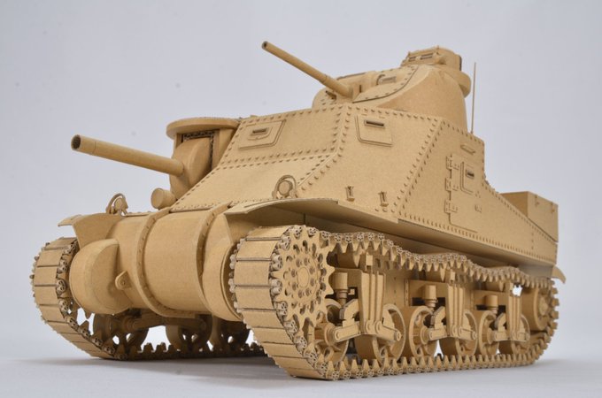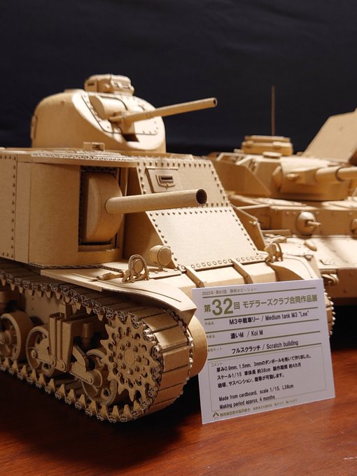 ダンボールでM3中戦車リーを作りました。 Medium Tank M3 "Lee" made from cardboard. Scale 1/15 (車体長 約38cm / Body length approx. 38cm) 製作期間 約4ヶ月 主砲・副砲可動、サスペンション可動、車輪回転、履帯可動 初めて履帯を動かすことができました。 #ダンボール工作 #ダンボール戦車 twitter.com/i/web/status/1…