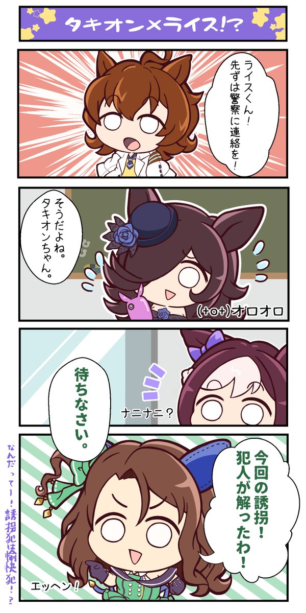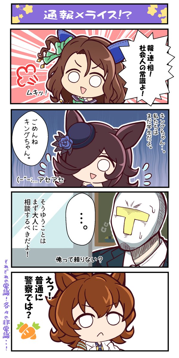 5 24 人生で110番通報したことがない( ゚Д゚)! ライスが主役のお話になります。 不定期の投稿になりますが ウマ娘の日常(異常)を描いていきます! #ウマ娘 #4コマ漫画 #キングヘイロー #ライスシャワー 23/06/22 11:38
