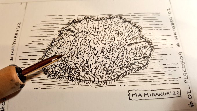 #Placozoa es uno de esos filos "extraterrestres" con pocas especies, tamaño máx. de 3 mm, de aspecto ameboide, ambientes marinos y tiene la organización más simple de todos los metazoos, ni siquiera tiene simetría, vamos una rareza! #inktober2022 #inktober2022day2 #zoology