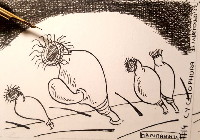 #Cycliophora uno de mis filos extraterrestres favoritos. Descubiertos en 1995, viven de forma sésil sobre apéndices de crustáceos, cuerpo muy modificado, dimorfismo sexual y ciclos muy conplejos. Alcanzan los 0,3 mm #inktober2022 #inktober2022day14