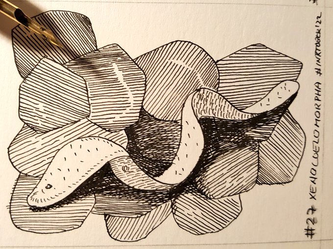 #Annelida un filo más conocido. Desde micras hasta 3m. Cuerpo segmentado en metámeros. Gran variedad de ambientes y de formas de vida, incluido em parasitismo de las conocidas sanguijuelas. #inktober2022 #inktober2022day15