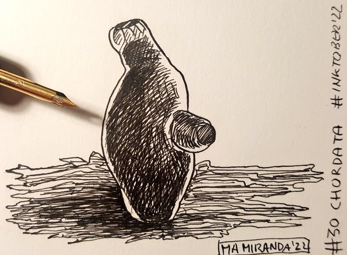 Y llegamos a #Chordata, el último filo que puede llegar hasta los 30m. Tienen una varilla flexible de sostén, la notocorda, y un cordón nervioso dorsal. Faringe perforada y cola situada en la parte posterior. Y ya...🤗🤗 #inktober2022 #inktober2022day30 #zoology
