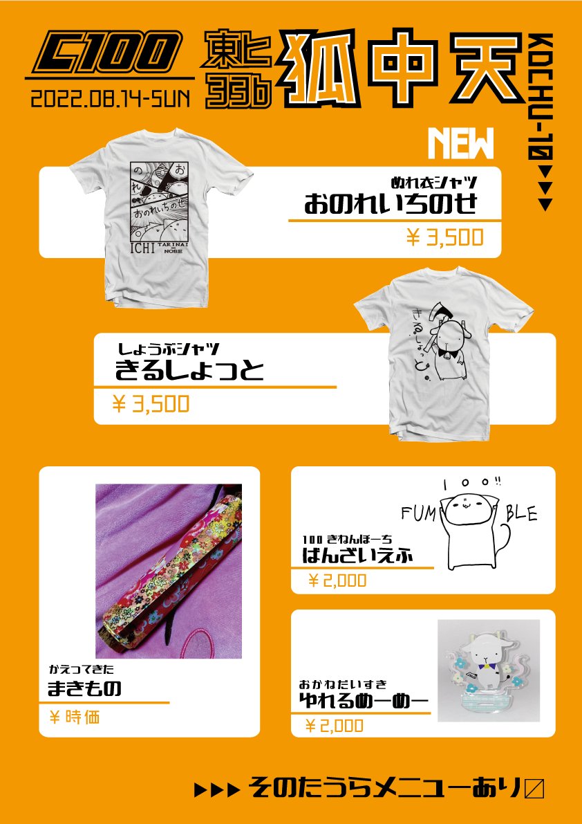 20 6 狐中天、お品書きグッズ部門です。 日曜東-ヒ33bでお待ちしております。 #C100 #うちは何屋だ 22/08/12 23:17