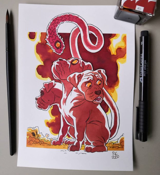 DÍA13: #CANCERBERO Más #INKTOBERTALENS de #MYTHSANDMONSTERS. Descubrir que tienes colita y que además es una reptil, no ayuda a tener buen carácter. Acuarela DIN A5 (148×210 mm). A LA VENTA 25€+ENVÍO. DM o e-mail a pedroj@pedrojcolombo.com #inktober #inktober2020
