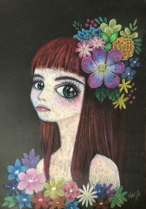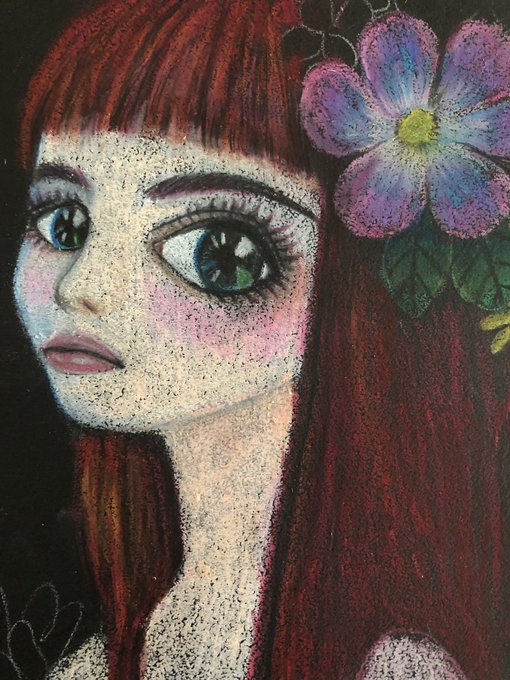 パステル+色鉛筆画できた。 ラフで描いたものや切り絵にしたものよりも柔らかいイメージになった。赤い髪と表情が気に入っている。 パステル画をもっとたくさん描いて上手くなりたい。 #絵描きさんと繋がりたい