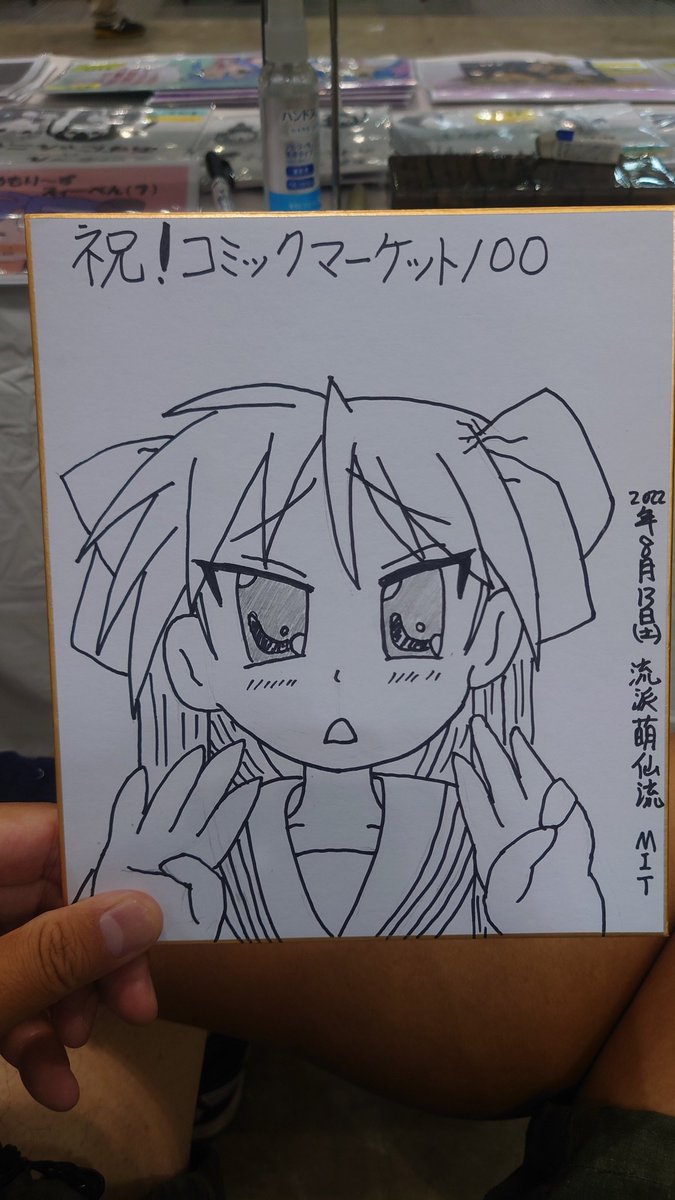 参加者様より 「色紙ってお願いしても大丈夫ですか?このキャラでお願いできますか?」 とのお願いで、かがみんを描きました。 ※実物は『○○様へ』と書き足しました。 聞くとコミケ初参加とのことで、らき☆すた島へ来るとは、なかなか見込みがある若者です #コミケ100 #コミックマーケット100