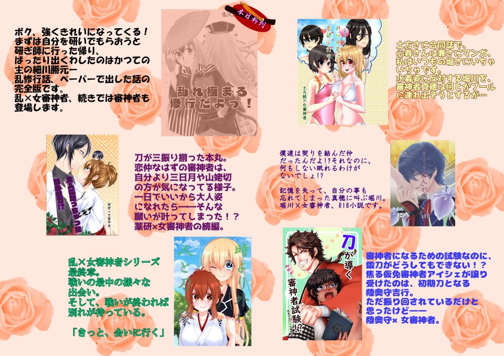 【宣伝】エアコミケ参加します!!日曜、とうらぶスペースです! 新刊は間に合わないので、既刊誌のみとなります。 現在とら、BOOTHにて通販中! #エアコミケ ec.toranoana.jp/joshi_r/ec/cot…