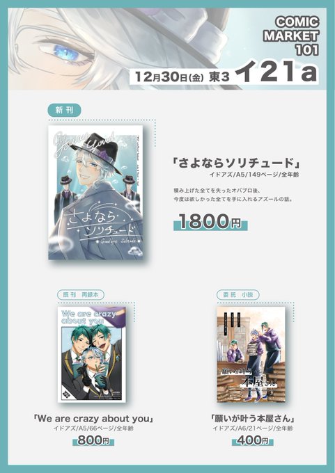 18 88 【C101新刊サンプル】 12/30(金)東3イ21a 新刊「さよならソリチュード」 イドアズ/A5/149ページ/全年齢 夏コミで出した準備稿の完全版になります。 イドアズが成立しボ部がお友達になる話です。サンプル途中から繋がってません。 ↓続きます (1/12) 22/12/25 20:18