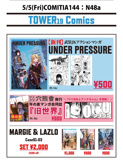 【N48a】TOWER19のコミティアお品書きです! 新刊は武装JK、既刊は年の差合同誌とバディ刑事のマンガです! ▼新刊・UNDER PRESSURE pixiv.net/artworks/10764… ▼既刊・旧世界 pixiv.net/artworks/79338… ▼既刊・M&L1話 pixiv.net/artworks/71803… #コミティア144 #COMITIA144 #コミティア144お品書き