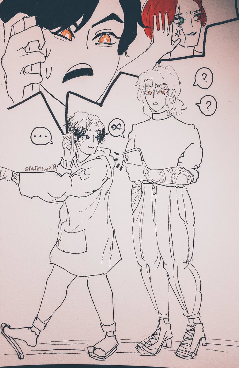 Day 6 - Peaceful times … Idk why this is the first time I’ve drawn them??? 🤣🤣😭 please, they deserve happiness (Outfits inspired by airport BTS Sope) #inktober2021 #inktober #jujutsukaisen #jjk #itadoriyuuji #fushiguromegumi #itafushi #traditionalart