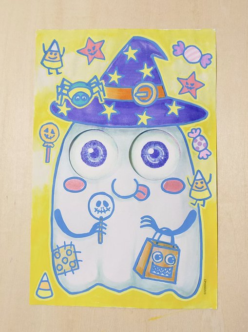 西友 #halloween ぬり絵3枚目。 この仕上がりでトータル5時間は…うーむ( ・᷄ὢ・᷅ )🎃 ポップな感じは出たからいいか! #Drphマーチン (背景) #nniポスカ (パステルカラー) #コピック #ハロウィン2020 #ハロウィンぬりえ