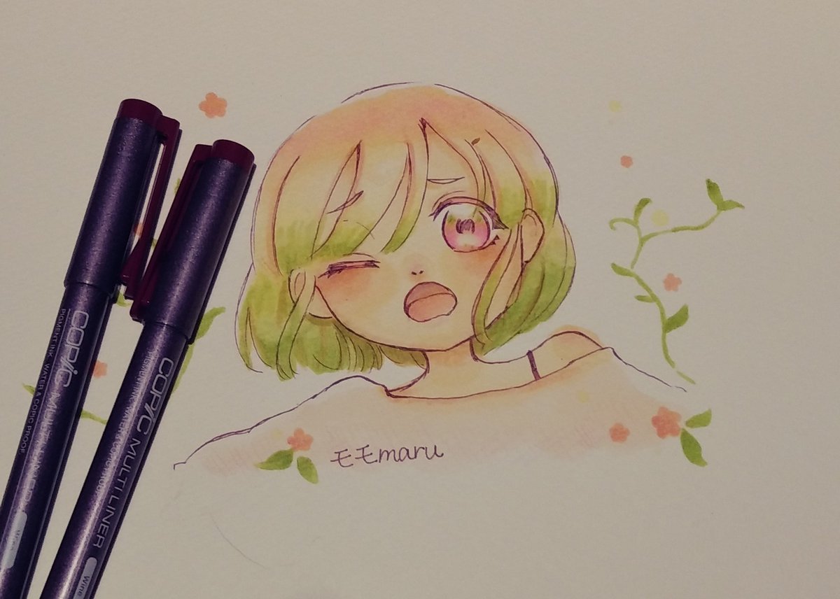 2 15 コピックマルチライナーを買ってみたので試し描きしました! 本当に滲みにくいですね、凄い…。 春🌸🌱をイメージして描いたのですが、見覚えのある髪色になってしまいました💦 アナログ楽しい(*ˊˋ*) #アナログ絵 #春 #創作 #絵描きさんと繋がりたい 20/03/16 21:28