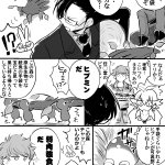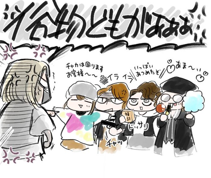 イベスト後、ゲーム内で0️⃣と👔で仲良く遊んでたのが🐴にバレて(🐦経由で)また集まることになったシャッフルトリオ(+🥂)妄想ラクガキ