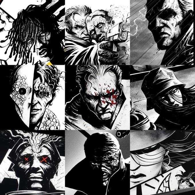 Hey, après 3 jours de taff voici mon #SixFanarts ! J'ai un attachement particulier pour chacun de ces personnages, tous bien badass, c'était génial de les dessiner.. @Hideki_Naganuma @FrankMillerInk @Atlus_West @Yoshi_OnoChin @DCComics_FR