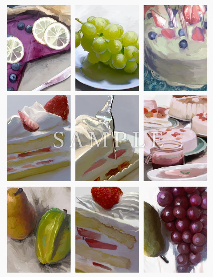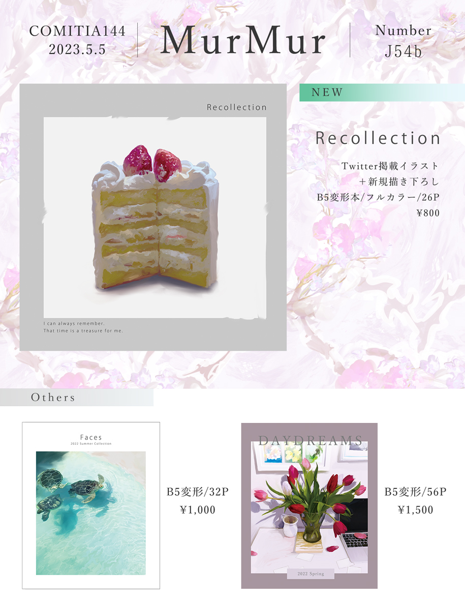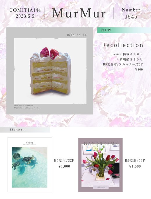 【#エアコミティア142 】 ケーキと花の絵をまとめた「DAYDREAMS」と、水と海の絵をまとめた「Faces」の通販を行なっています💐 srsrmrmr.booth.pm #エアコミティア