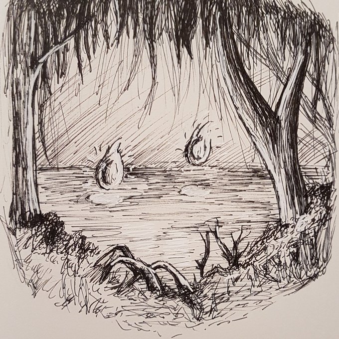 #Inktober 2. Wisp • A couple of will-o'-the-wisps over the water amongst some (wispy) weeping willows. • • • #inktober2020 #inktoberwisp #wisp #willothewisp #folklore #mythology #fantasyscene #penart #pensketch #blackandwhiteart