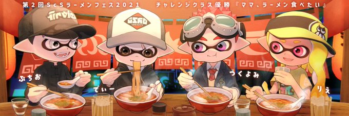 57 411 スヴィさん主催のラーメンフェス、チャレンジクラス優勝記念のイラストを描かせて頂きました🍜✨ 時間がかかってしまい申し訳ない…!イカちゃんたちもラーメンも描いていてとても楽しかったです! 22/02/27 17:13