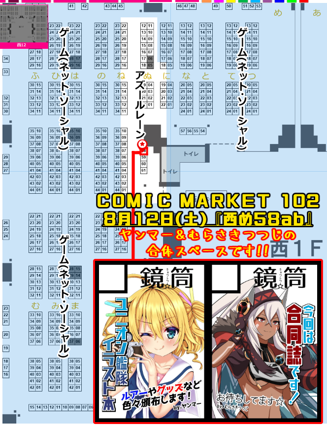 ◎あなたのサークル「鏡筒」は 土曜日 西地区 “め” ブロック 58ab に配置されています。 …壁!? ヤンマーさん(@yanmar195)との合体サークルで沢山のグッズやルアーを頒布します!是非遊びに来てくださいね!暑い夏にします!ᕙ( 'ω')ᕗ 🔶webカタログ webcatalog-free.circle.ms/Circle/17303134 #C102WebCatalog