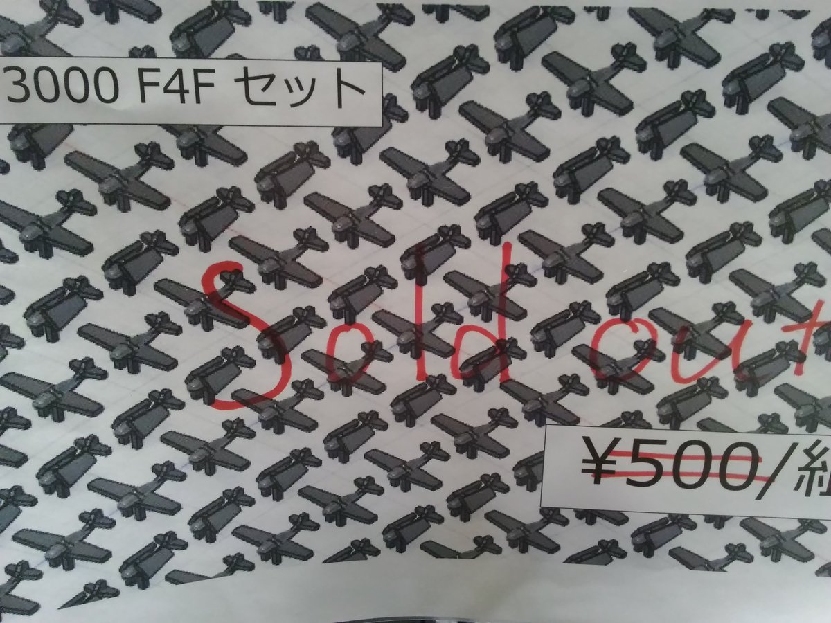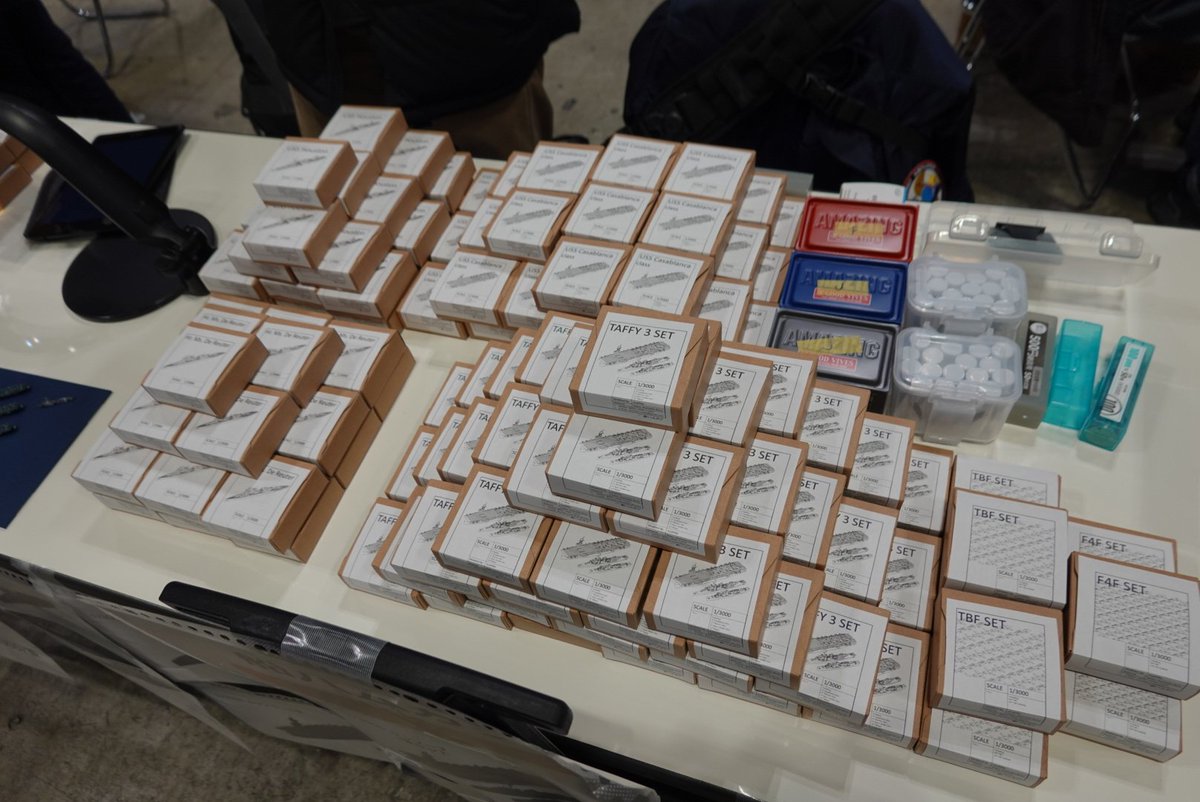 23 49 ワンフェス2020冬お品書き④ 艦載機 《1/3000 F4F セット》:¥500 《1/3000 TBF セット》:¥ 500 調子に乗って作り過ぎたのでロット丸ごと単品販売します。翼展開状態と格納状態のセットでTBFは90機、F4Fは100機ほど入ってます。大和の周りに飛ばすのにいかがでしょうか。 #wf2020w #集める軍艦 20/02/02 10:15