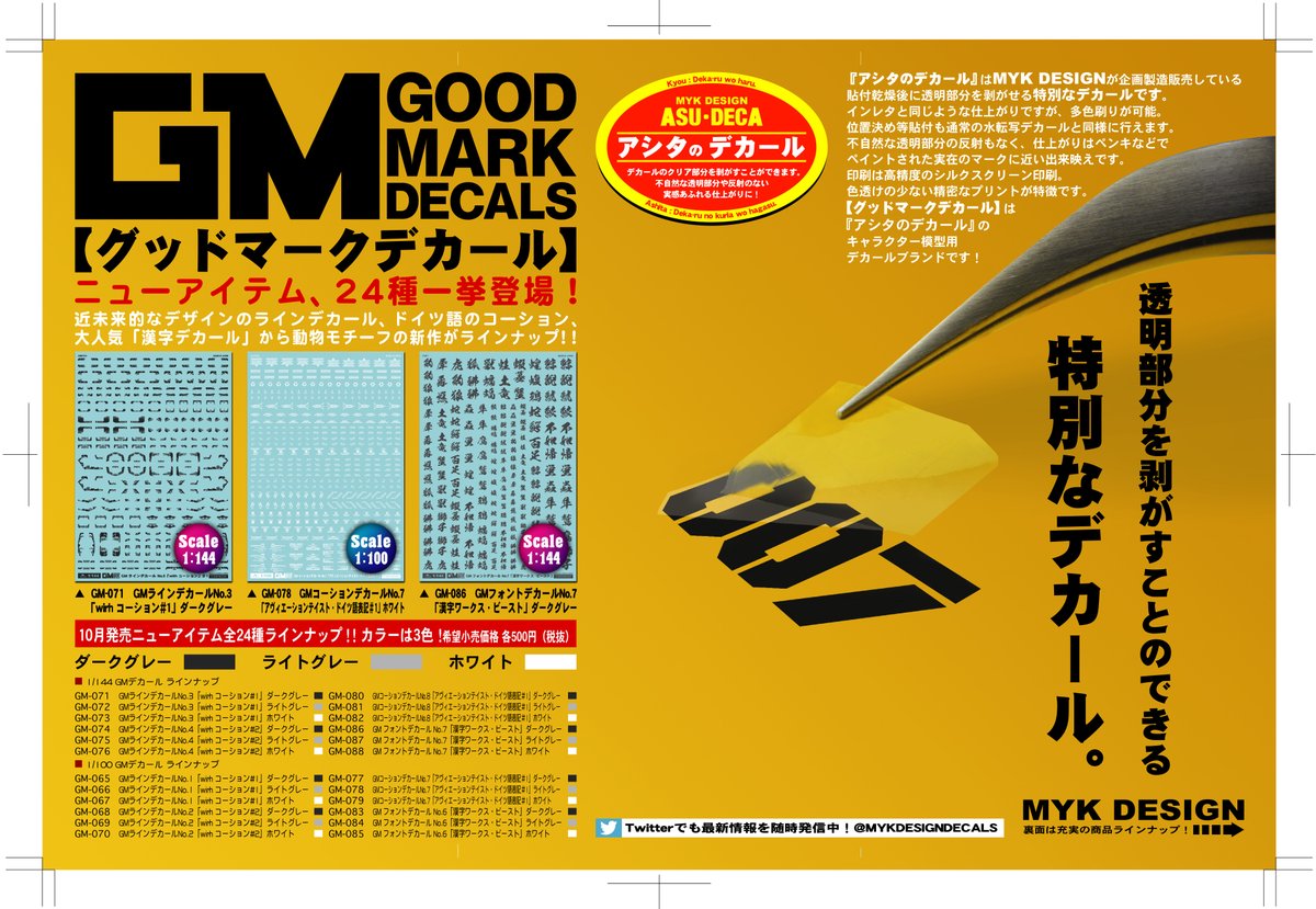 #グッドマークデカール 12月下旬新製品 『オペレーションテキスト』フライヤーです。 裏面はGMデカールの全商品ラインナップ。 今回はカラーをアイコンっぽくしてみました。 店頭でお見かけの際は是非お手にとってご覧ください。 #アシタのデカール #MYKデザイン #ガンプラ
