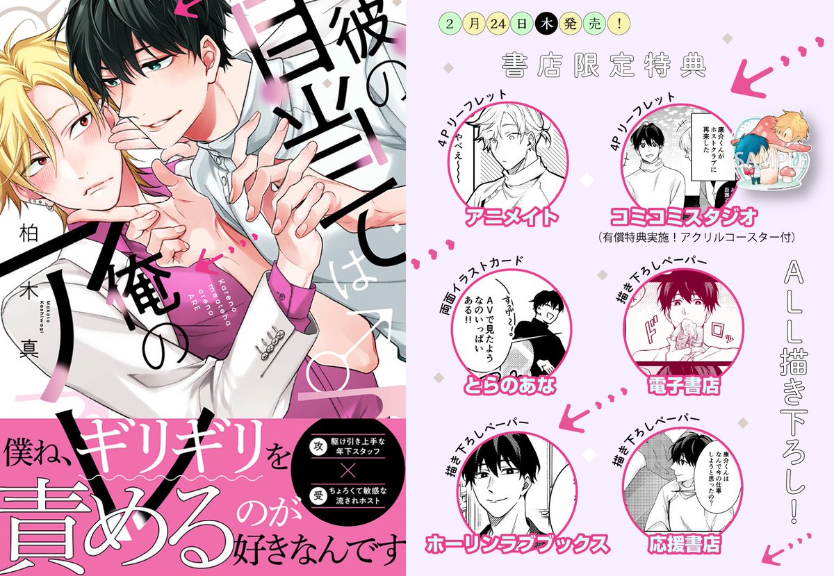 書店別の特典一覧です!単行本タイトルは『彼の目当ては俺のアレ』です。よろしくお願いします~ #彼の目当ては俺のアレ