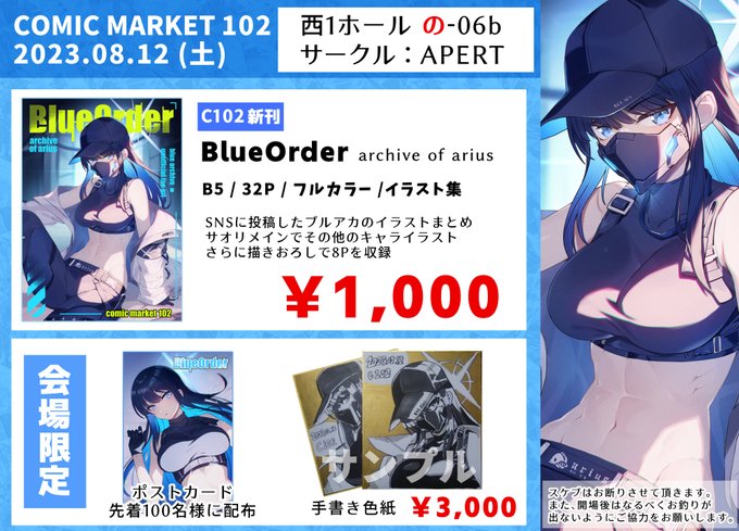 C102新刊「BlueOrder archive of arius」が予約開始致しました! ツイッターに投稿しているブルアカイラストまとめ+描きおろし8Pのイラスト集第一弾となっております! メロンブックス様の方で取り扱って頂いております。 melonbooks.co.jp/detail/detail.…