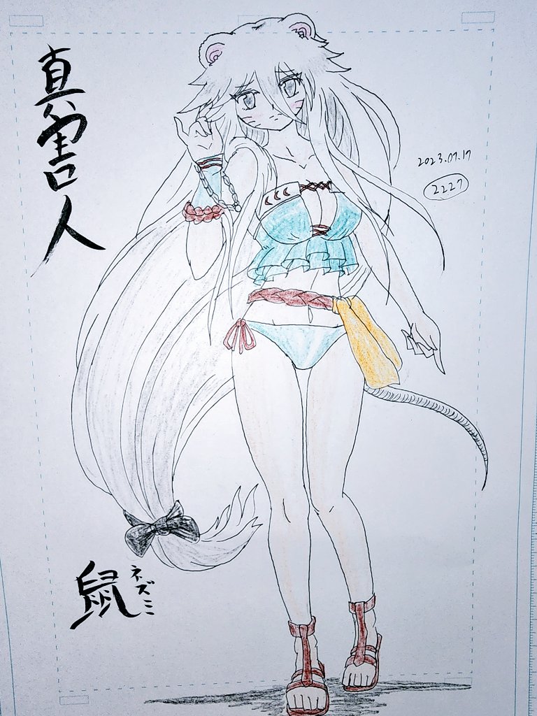 オリキャラ水着コンテスト。 鼠の人。水着2回目。 始めは嫌そうでしたが、やってみたら楽しかった様子。ので2回目も潔く着て貰えました。 (^_^)v #真害人 #イラスト