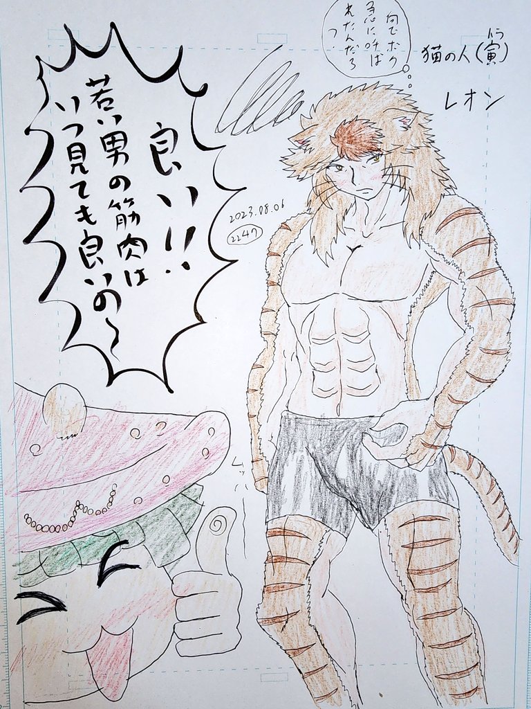 5 17 創作漫画、水着コンテスト10P11P。 前のページで終わりにしても良かったのですが、男女平等にしようとおもい♂️キャラにも一肌脱いで貰いました。 筋肉量が多い猫の人(寅)レオン君に来て貰いました。需要があれば幸いです (  ̄▽ ̄) #イラスト #真害人 23/07/30 13:57