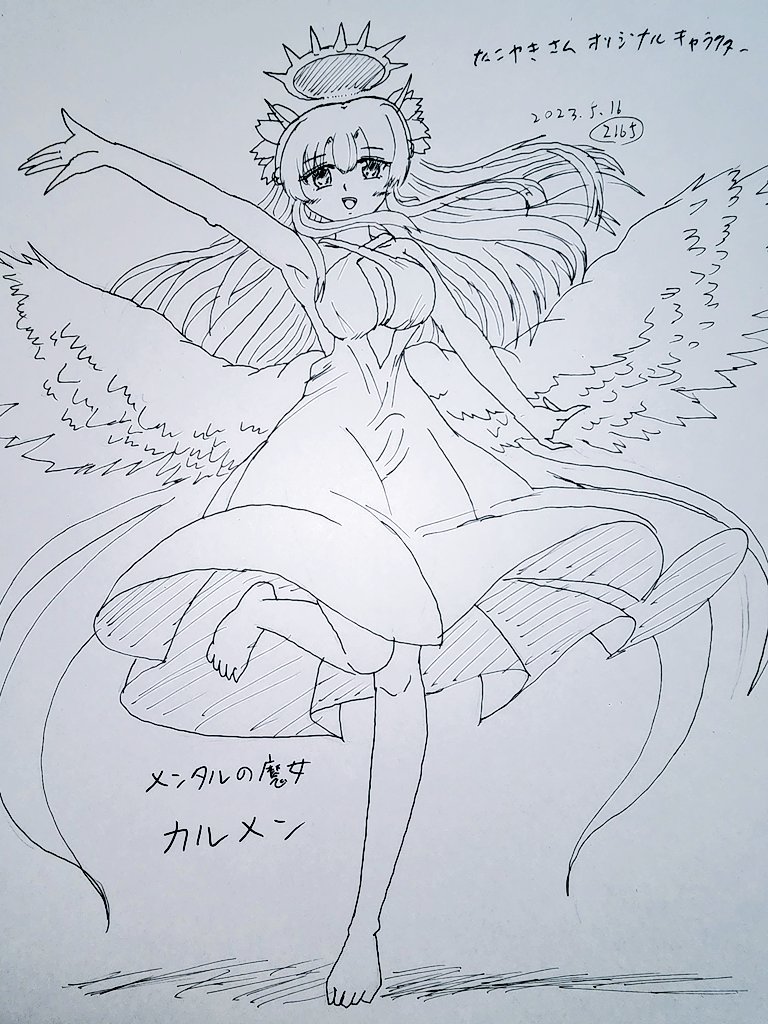 11 36 たこやきさんオリジナルキャラクター。 メンタルの魔女カルメン。 元絵↓ twitter.com/qMrn5hTw0IADKG… 天使の輪や大きな羽が特徴ですね。王道の可愛いキャラが描きたくなったので御借りしました(*`・ω・)ゞ #イラスト 23/05/06 23:12