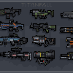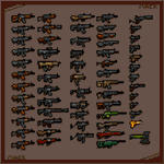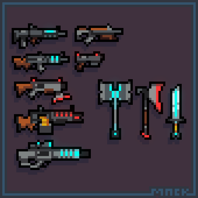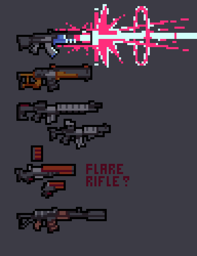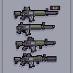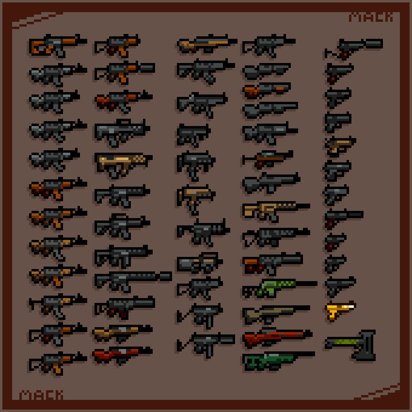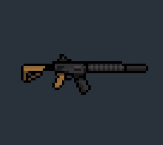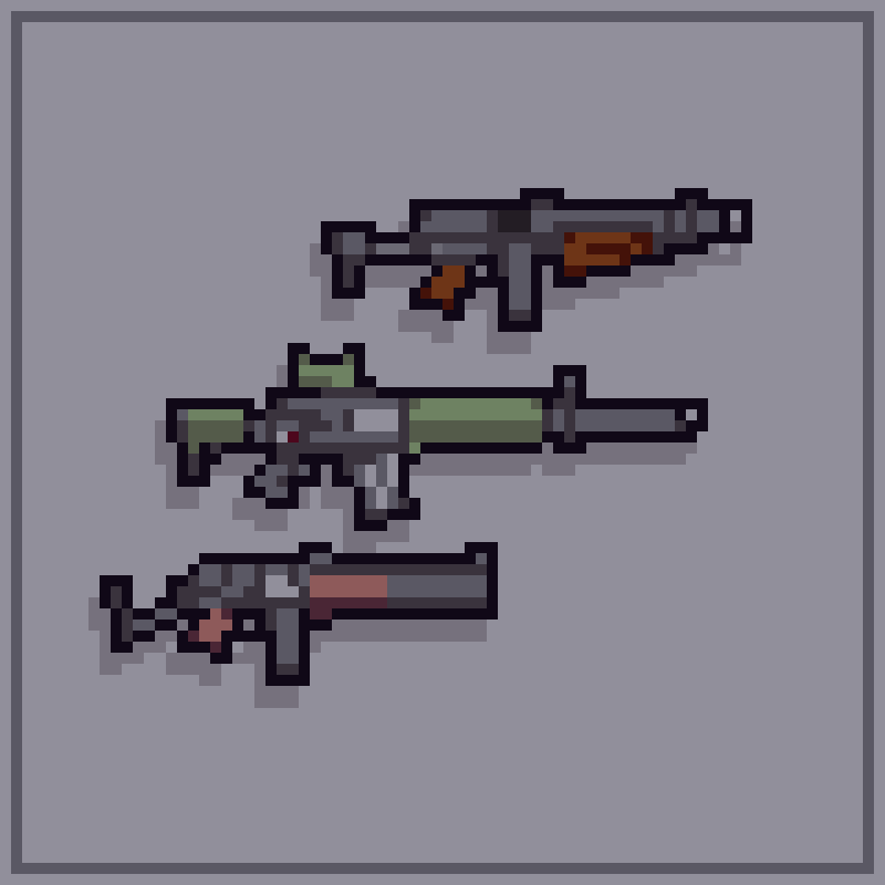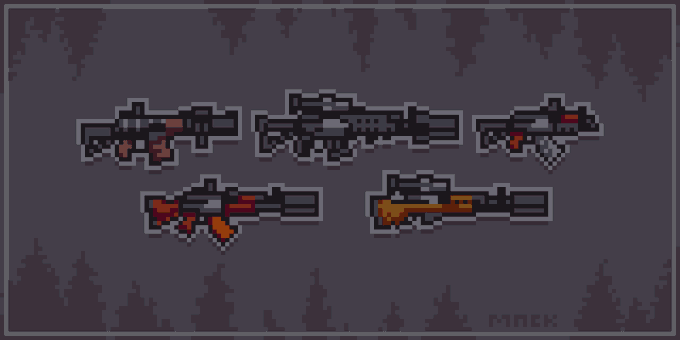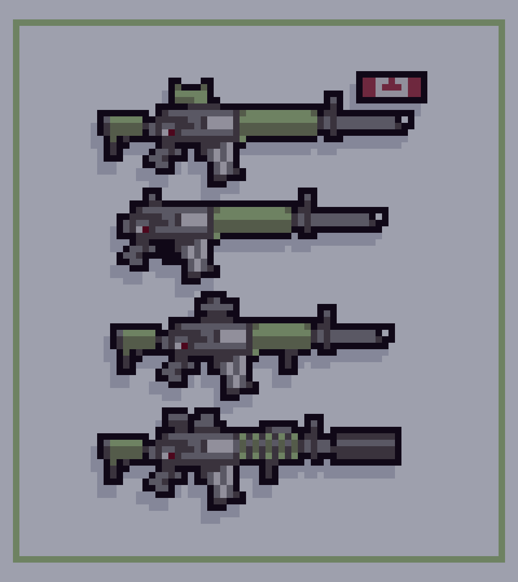 3 fictional guns in @TheRogueNorth. A 9mm Russian SMG-3 developed in the early 80s. Canadian C9 standard arctic warfare rifle. And the VSG, a delayed-blowback 10mm SMG derived from the popular AS VAL. #pixelart