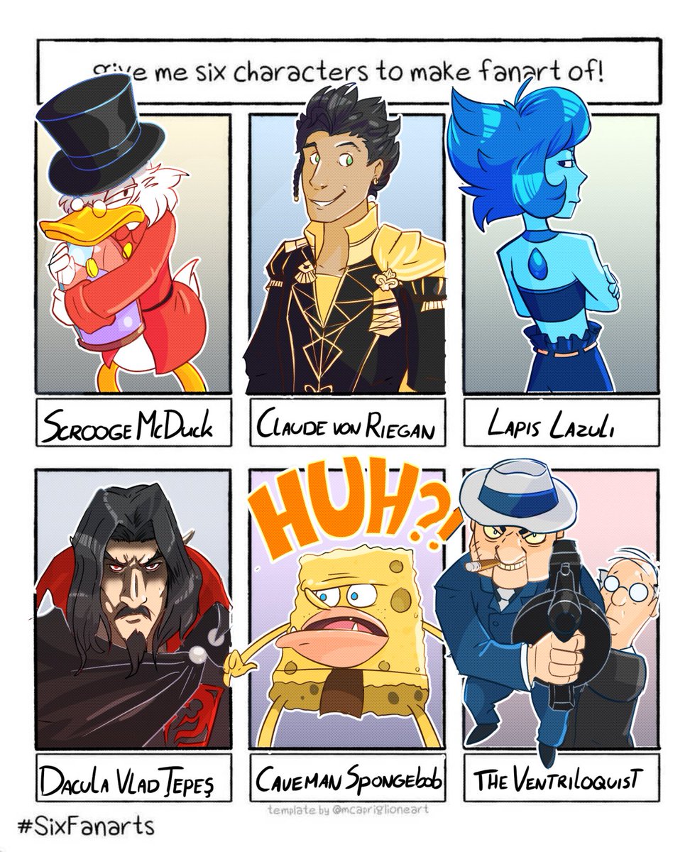 Heyooo! This is my take on the six fanarts meme! Hope you all like it 😊 #SixFanartsChallenge #sixfanartchallenge #SixFanarts #ducktales #fireemblem #stevenunivese #castlevenia #spongebobmemes #batman
