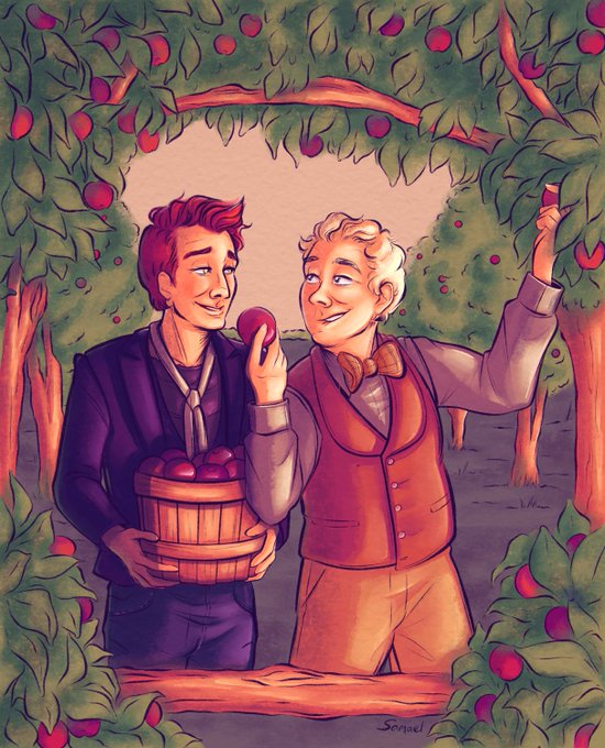 Autumn means it’s time for an apple picking date! I think Aziraphale might be teasing Crowley, just a bit 😁 #goodomensfanart #ineffablehusbands #aziraphalexcrowley #crowleyxaziraphale