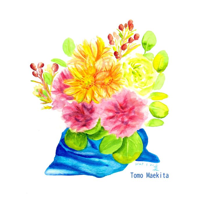 0 5 2022.5.7 明日は、母の日。 アフタヌーンティー+日比谷花壇のコラボアレンジフラワーが可愛い過ぎて、自分のも買った。 背景の色鉛筆は関係ないです💦 #アナログイラスト #アナログ絵 #水彩強化マラソン2022春 #水彩日和 #イラスト #アナログイラスト #水彩 #母の日 #花 22/05/07 17:44